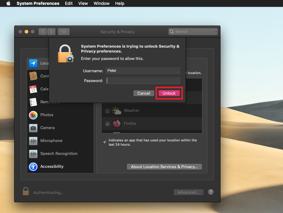 3. In the Security & Privacy window, Click on lock button to make changes(Bottom left corner).