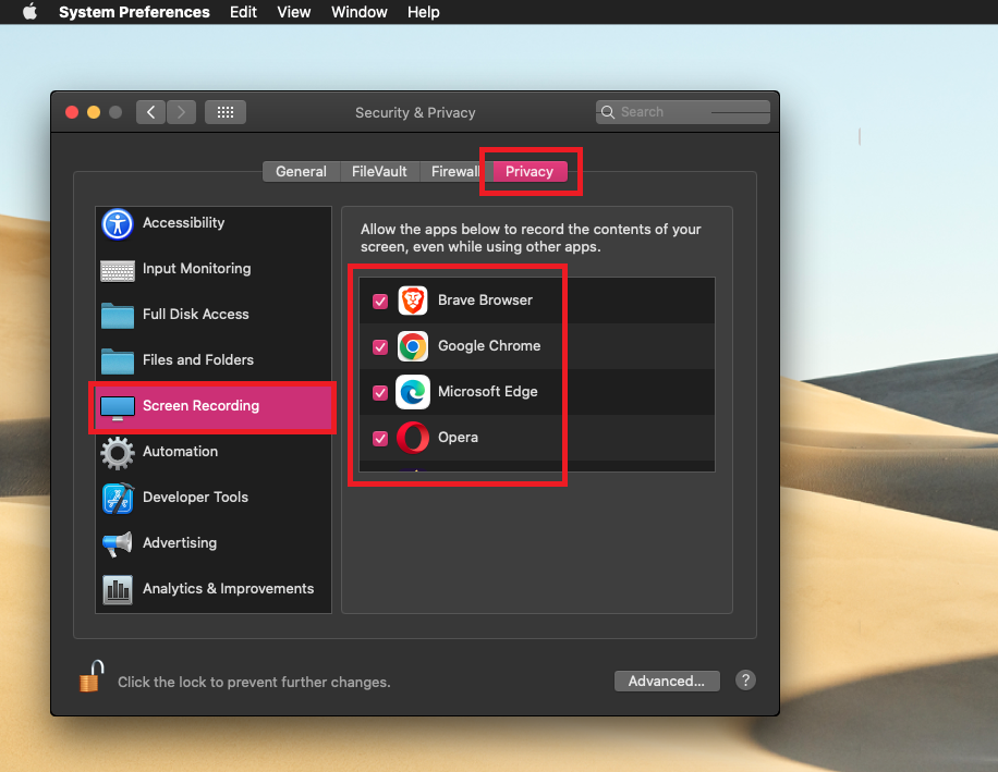 5. Please make sure you are in "Privacy" tab. In the left menu click on "Screen Recording". In the right side, click on check box of browsers to allow screen recorder.