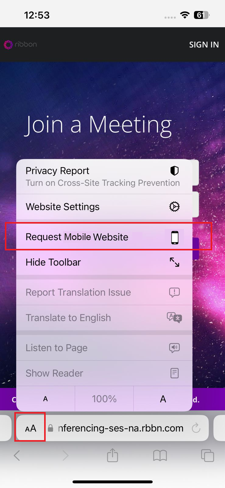 1. Tap on AA (In Address bar) → Tap on Request Mobile Website.